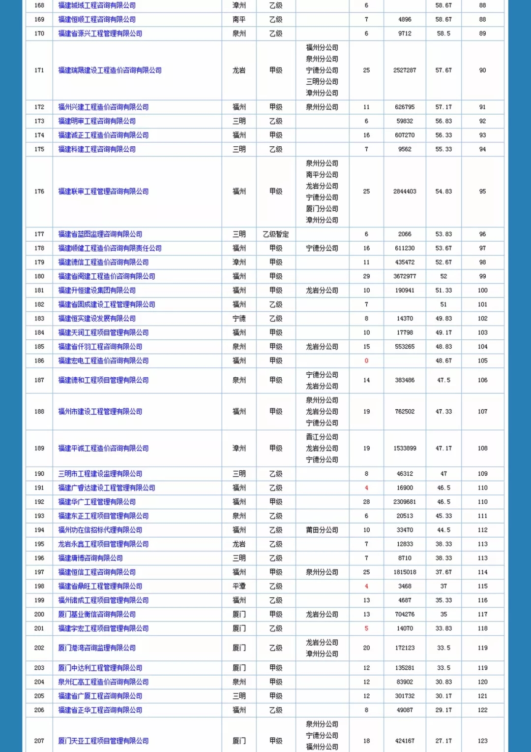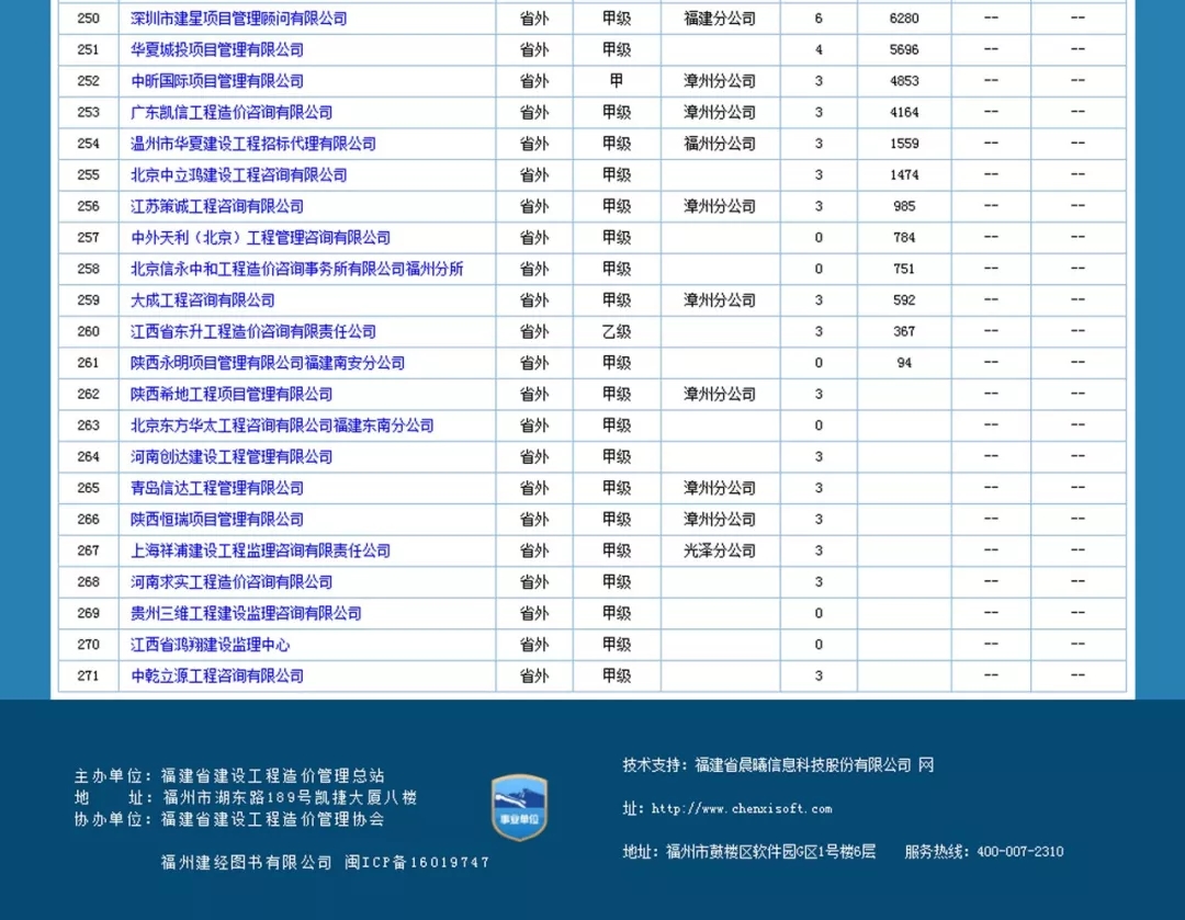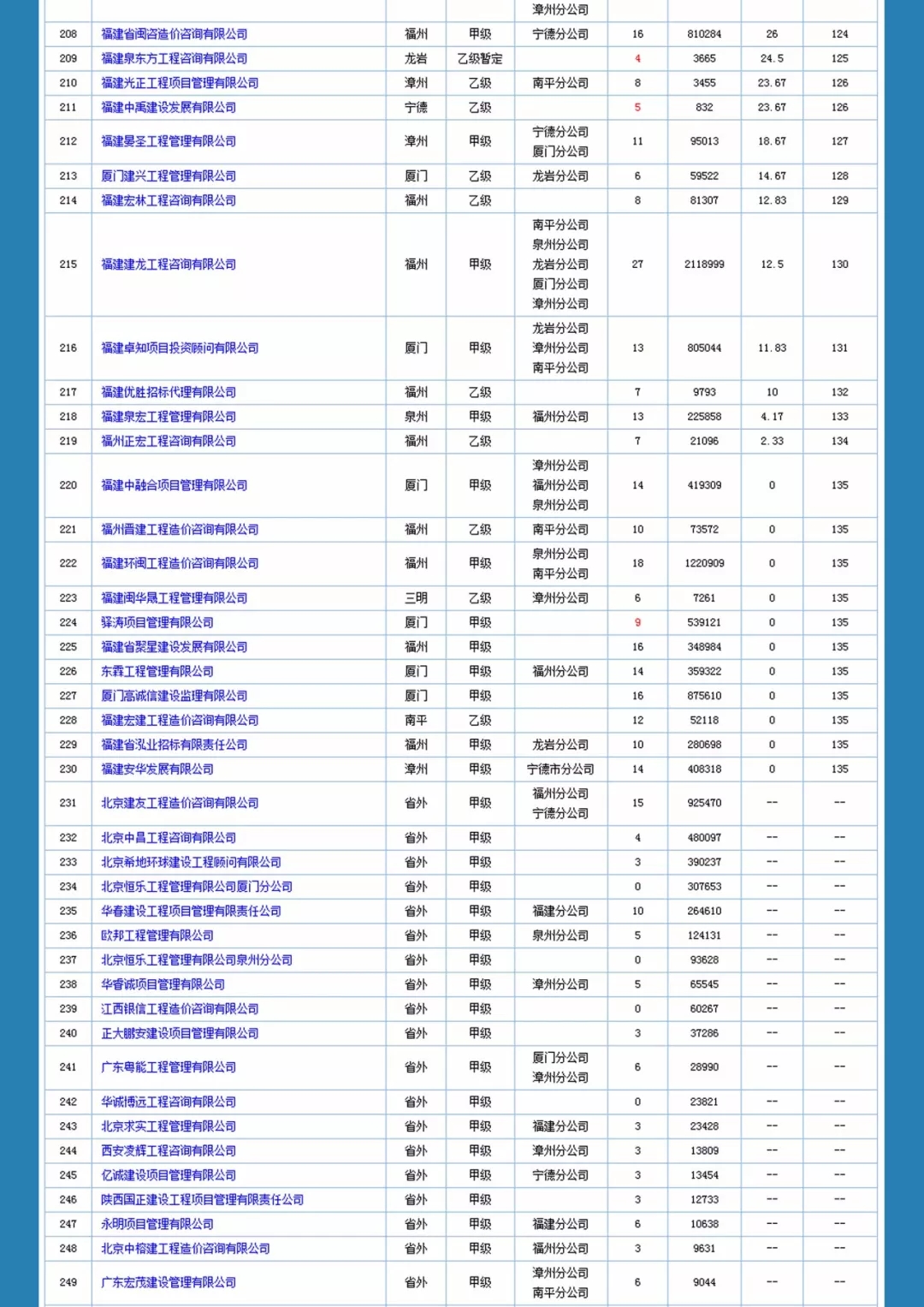 近日,福建省建设工程造价信息网公布《2017年度工程造价咨询企业信用综合评价结果》。 我公司2017年度信用得分排名第七,2017年度备案项目总造价排名第三。两项指标综合体现了我公司综合实力强,在福建业内名列前茅,仅次于央企建行福建省分行。我公司将再接再励,向同行先进单位学习,进一步提高发展!