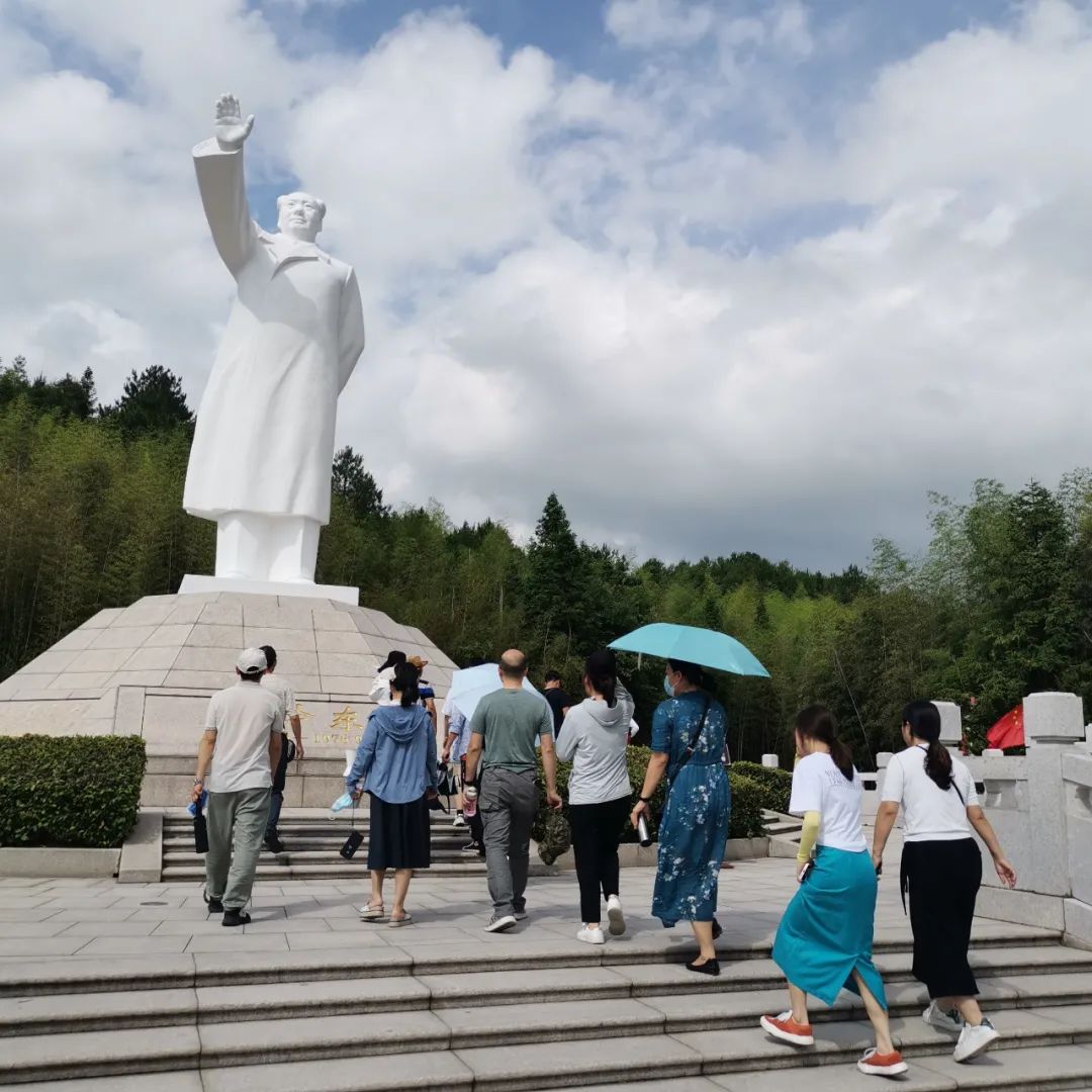 会址北侧的毛主席纪念园依山而建,庄重肃穆。党员们沿着151级台阶拾阶而上,怀着崇敬的心情,集体向毛主席雕像致敬三鞠躬。随后,换步绕行雕像一周,静默基座上镌刻的毛主席诗词,感受先辈的革命豪情,汲取红色力量。